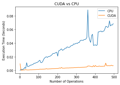It is interesting to note that it is faster to perform the CPU task for small matrixes. Where for larger arrays, the CUDA outperforms the CPU by large margins.